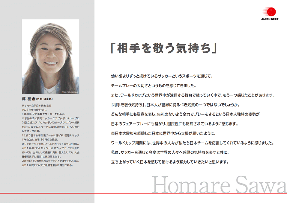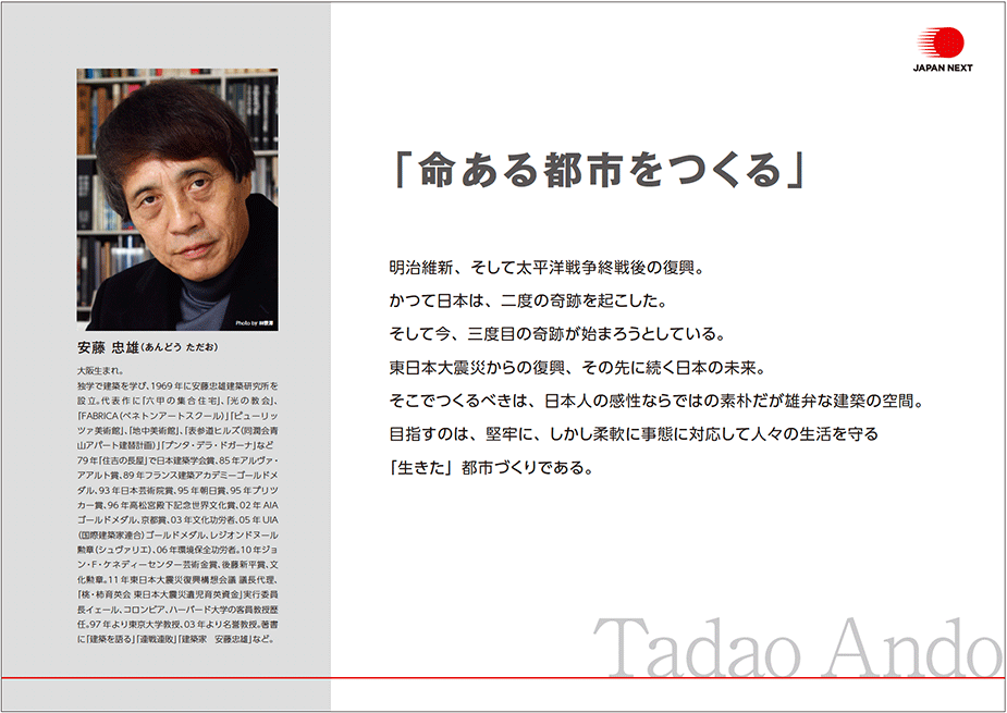 Japan Next 震災復興イベントパネル 2023.09.042023.07.27 Japan Next 震災復興イベントパネル [業種]官公庁 [仕様]A2サイズ 多言語制作 全240枚 [担当]クリエイティブディレクション/デザイン [制作期間]3ヶ月 ●東日本大震災に諸外国から寄せられた厚意への謝意を表するために催されたイベントで掲出するためのパネル制作をしました。 ●世界16の国と地域イベントで掲出しました。日、英、独、伊、仏、露、中、韓 8カ国語制作。 ●世界192の在外公館へデータで納品もしました。 安藤忠雄 澤 穂希 佐藤可士和